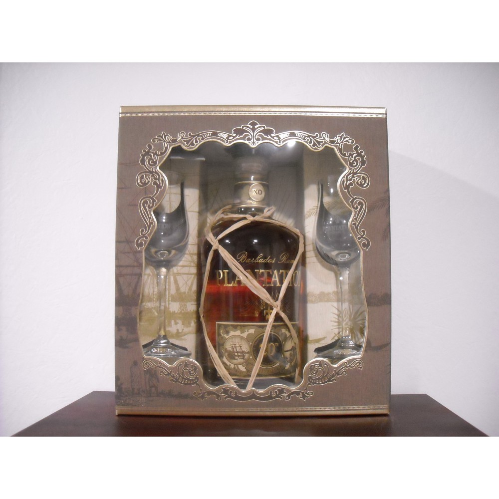 Ce coffret contient une bouteille de rhum et deux verres. C'est un assemblage de différents rhums de Barbades passés en fût de Cognac.