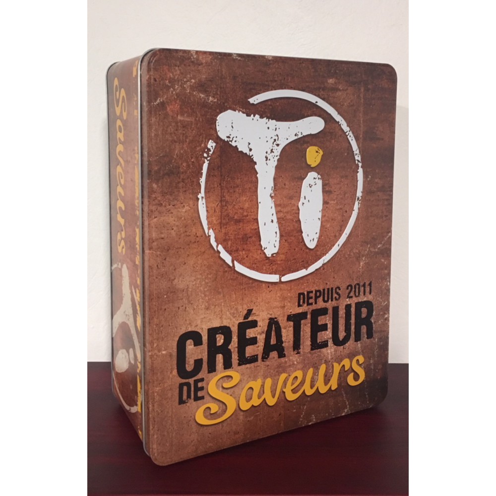Un coffret métal "créateur de saveur", 2 verres sérigraphiés "Ti", 1 bouteille de Ti'arrangé Pomme Gingembre