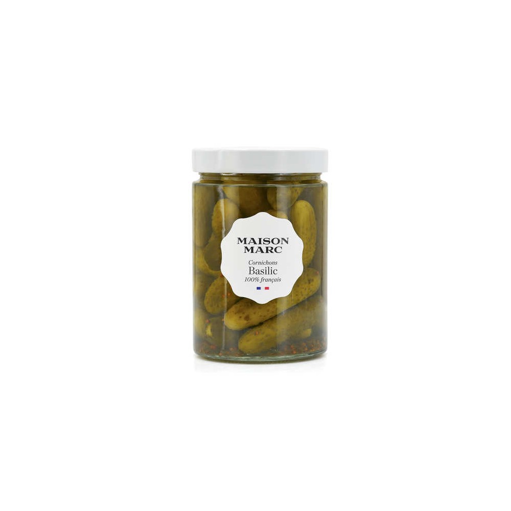 Ce sont des cornichons en bocal aromatisés au basilic. Ils sont produits par la Maison Marc, une entreprise familiale Française spécialisée dans la production de cornichons depuis 1923. Ils exercent leur savoir-faire à Chemilly-sur-Yonne en Bourgogne