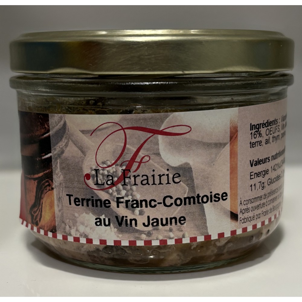 La terrine Franc-Comtoise au vin jaune est produite par la Frairie de Bourgogne. C'est une entreprise Française, spécialisée dans les plats cuisinés et terrines en bocaux de verre. Elle est situé à Allériot en Saône-et-Loire, en Bourgogne.